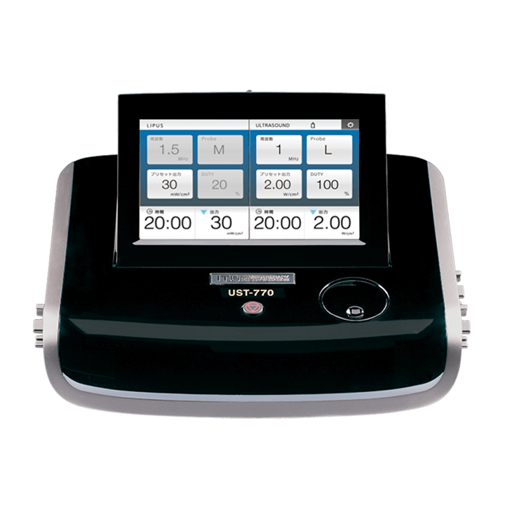 2つの超音波技術「ULTRASOUND」と「LIPUS」を融合して生まれたのが、この「イトー UST-770」です。治療の幅を大きく広げることはもちろん、タッチパネル操作をはじめ使い勝手を追求した様々な機能により治療効率もさらに高めます。デザインにおいても、カラーやフォルムの細部にまで徹底的にこだわり、品質感と機能性を備えた超音波治療器を実現しました。「イトー UST-770」が毎日の治療を、どこまでもやさしく、スマートにします。